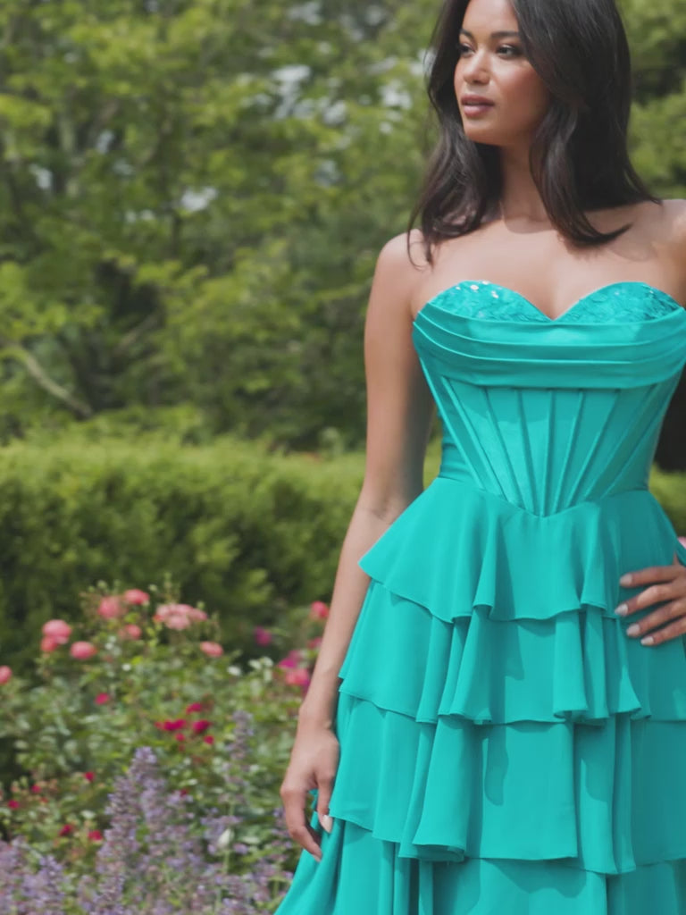 Peekaboo Corset Satin And Chiffon Dress With Tiered Ruffled Skirt | 11436/11436E